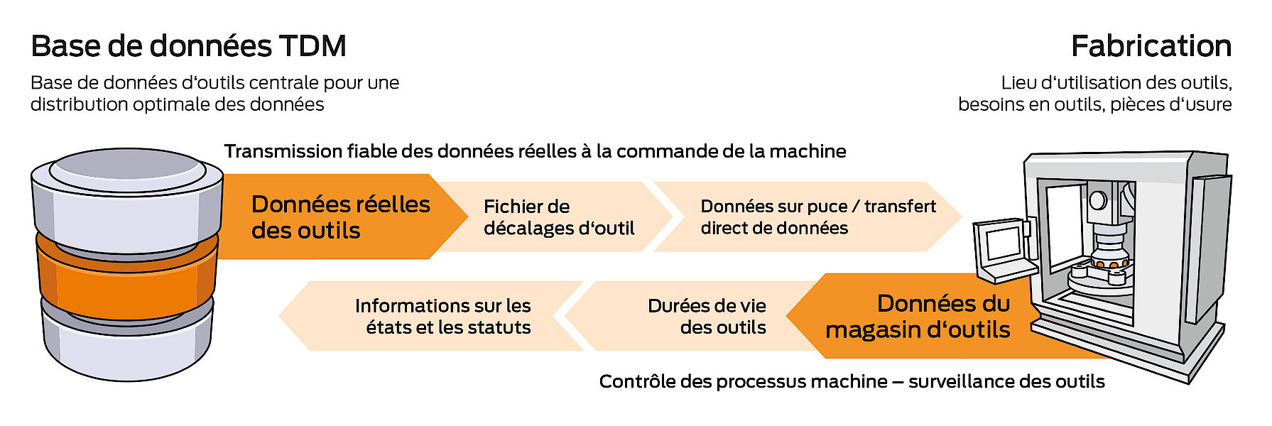 Avec la release 2026 de TDM, nous franchissons une nouvelle étape décisive vers une gestion d’outils numérique cohérente pour l’ensemble de l’atelier. Notre feuille de route met l'accent non seulement sur la gestion numérique des données d'outils, mais aussi sur son intégration automatisée dans la machine avec une connexion standard, sans interruption ni étapes intermédiaires manuelles. Cela permet de maximiser la fiabilité de vos processus autour de la machine.